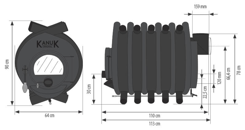 Der Warmluftofen Kanuk 22 kW ist ein wahres Kraftpaket. Trotz seiner Leistung ist er sehr kompakt geraten. Lediglich 90 x 64 x 110 cm (HxBxT) misst der Warmluftofen. Dabei sollte er Sie vor keine Probleme bei der Platzwahl stellen, zumal sich das Modell vom Design her vielfältigst integrieren lässt. Je nach Aufstellort haben Sie auch eine große Auswahl an Podesten und Verkleidungen zur Auswahl, wodurch Sie Ihren Ofen noch individueller gestalten können.